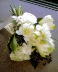 晩秋~冬の花の女王、白のアマリリスを主役にしたアームブーケ。凛とした美しさを引き立てる濃紺の実ものをサムシングブルーとして取り入れました。クラッチブーケより縦長のフォルムでスレンダーやマーメイドラインのドレス、濃紺のドレスにもよく似合います。かわいい系よりかっこいい系・大人系を目指すお洒落な花嫁様に☆東京23区内・舞浜の会場へ送料無料にてお届けいたします。