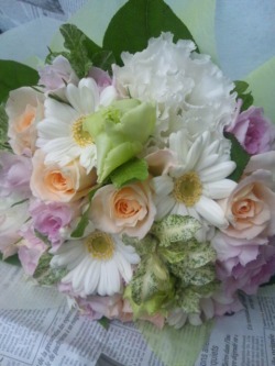 ※花嫁様がドレスで投げやすいよう普通の\3000の花束よりぐんと小ぶりで不織布とリボンでのラッピングとなり、特にお申し出のない限りセロハンはつきません。