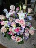 淡い紫・ピンク系のお花でまとめたとても上品で優しいアレンジメントです。 中央区・千代田区送料無料にてお届けいたします♪