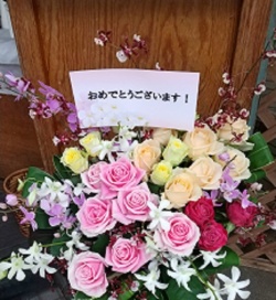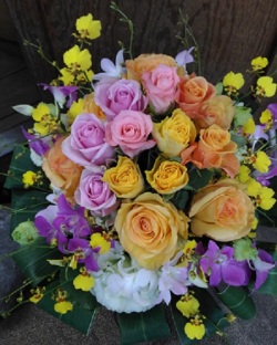 さまざまな色・種類のバラとランがたっぷり入ったとても華やかでポリューミーなアレンジメントです。 見る角度によって少しずつ色味が異なるので、各種お祝い・パーティーなど大勢の方の目に触れる場所にもぴったりです☆ 中央区・千代田区へ送料無料にてお届けいたします♪