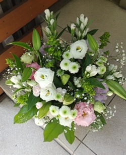 白ユリを中心にとげのない白とごく淡い優しい色合いのお花ばかりでまとめたお供え用アレンジメントです。新盆や法事などにどうぞ。